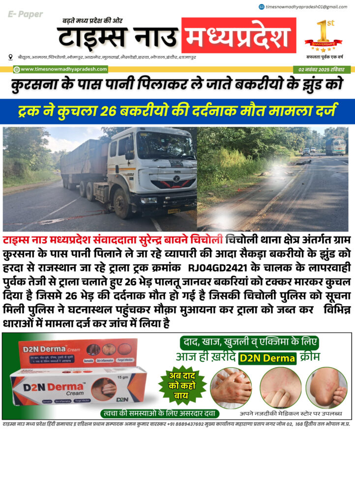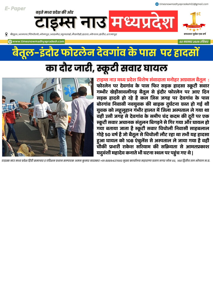 मध्यप्रदेश बैतूल आज के मुख्य समाचार timesnowmadhyapradesh02@gmail.com November 2, 2025 About the Author timesnowmadhyapradesh02@gmail.com Administrator Visit Website View All Posts Continue Reading Previous: देश का दिल मध्यप्रदेश: संघर्ष, संयोग और गौरव की 70 साल की कहानी, मध्यप्रदेश 70वां स्थापना दिवसNext: मध्य प्रदेश : आज के मुख्य समाचार Leave a Reply Cancel replyYour email address will not be published. Required fields are marked *Comment * Name * Email * Website Save my name, email, and website in this browser for the next time I comment. Related Stories मध्यप्रदेश मध्य प्रदेश विधानसभा का बजट सत्र शुरू, राज्यपाल के अभिभाषण से हुई कार्यवाही की शुरुआत timesnowmadhyapradesh02@gmail.com February 16, 2026 बैतूल आसपास Betul Update मध्यप्रदेश गाय से दुष्कर्म के वीडियो के बाद दामजीपुरा में तनाव, तीन दुकानों में आगजनी, आरोपी हिरासत में timesnowmadhyapradesh02@gmail.com February 1, 2026 मध्यप्रदेश खास खबर: साइबर ठगों के रडार पर बैतूल, ‘डिजिटल अरेस्ट’ के नाम पर 23.50 लाख की ठग : सावधान रहें! timesnowmadhyapradesh02@gmail.com January 9, 2026