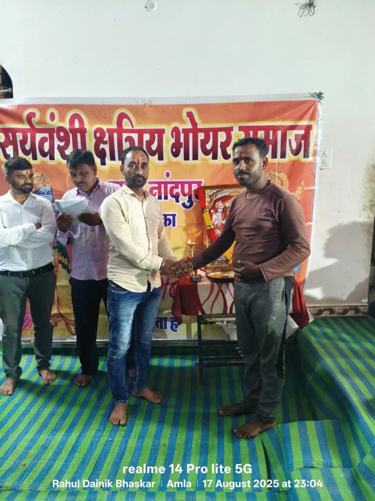 जयंत गोहे आमला – ग्राम नांदपुर रविवार को शाम 7:00 बजे सूर्यवंशी क्षत्रिय भोयर कुर्मी समाज द्वारा समास राजन कार्यक्रम के अंतर्गत समाज में युवा संगठन गठन कार्यक्रम के अंतर्गत ग्राम नांदपुर श्री राम मंदिर परिसर सूर्यवंशी क्षत्रिय भोयर कुर्मी समाज के युवाओं द्वारा सामाजिक बैठक का आयोजन किया गया जिसमें ब्लॉक के लगभग 8 ग्रामों की समितियां के पदाधिकारी एवं वरिष्टगन उपस्थित रहे जिसमें ग्राम की युवाओं द्वारा युवा संगठन का गठन किया गया जिसमें युवा संगठन द्वारा समाज की वरिष्ठ पदाधिकारी को भी आमंत्रित किया गया एवं उनके दिशा निर्देश के अनुसार युवा संगठन का गठन किया गया जिसमें युवा संगठन विभिन्न पदों पर युवाओं की नियुक्ति की गई